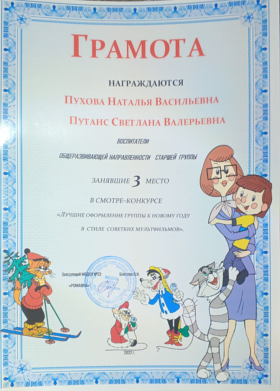 СМотр-конкурс "Лучшее оформление группы к Новому году в стиле Советских мультфильмов", 3 место, 2022г