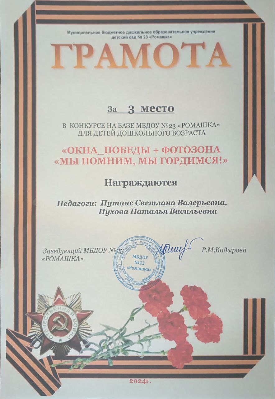 Конкурс на базе МБДОУ №23 "Окна победы + фотозона "Мы помним, мы гордимся!" , 3 место, 2024г