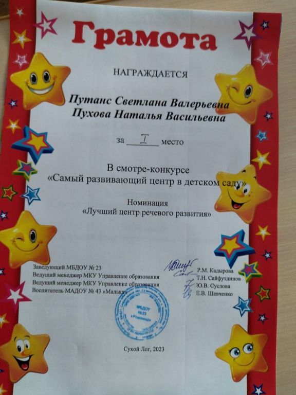 СМотр-конкурс "Самый развивающий центр в детском саду" МБДОУ №23, 2 место, 2023 г.
