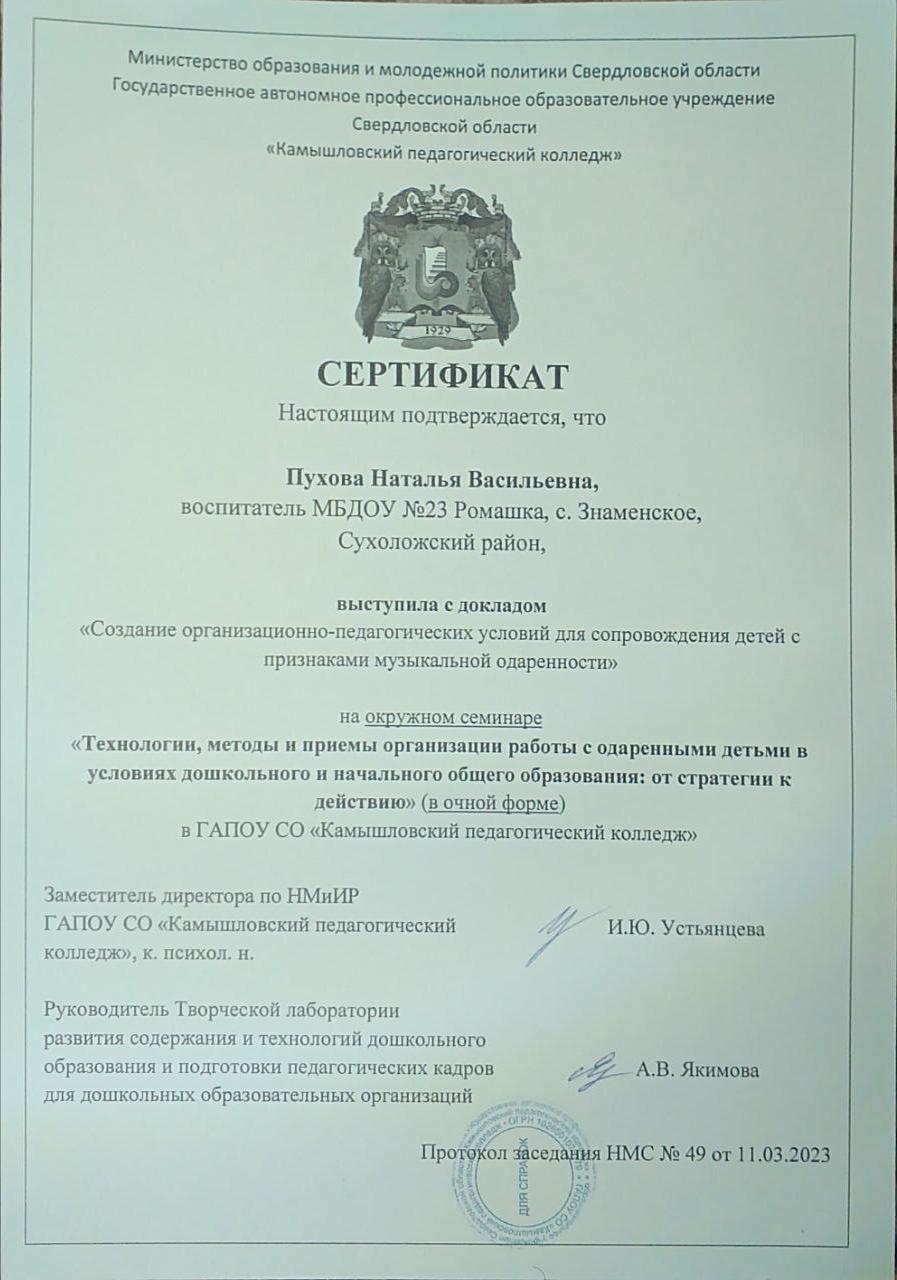 Окружной семинар "Технологии, методы и приемы организации работы с одаренными детьми в условиях дошкольного и начального общего образования от стратегии к действию" ГАПОУ СО "КАмышловский педагогический колледж", 2023г.