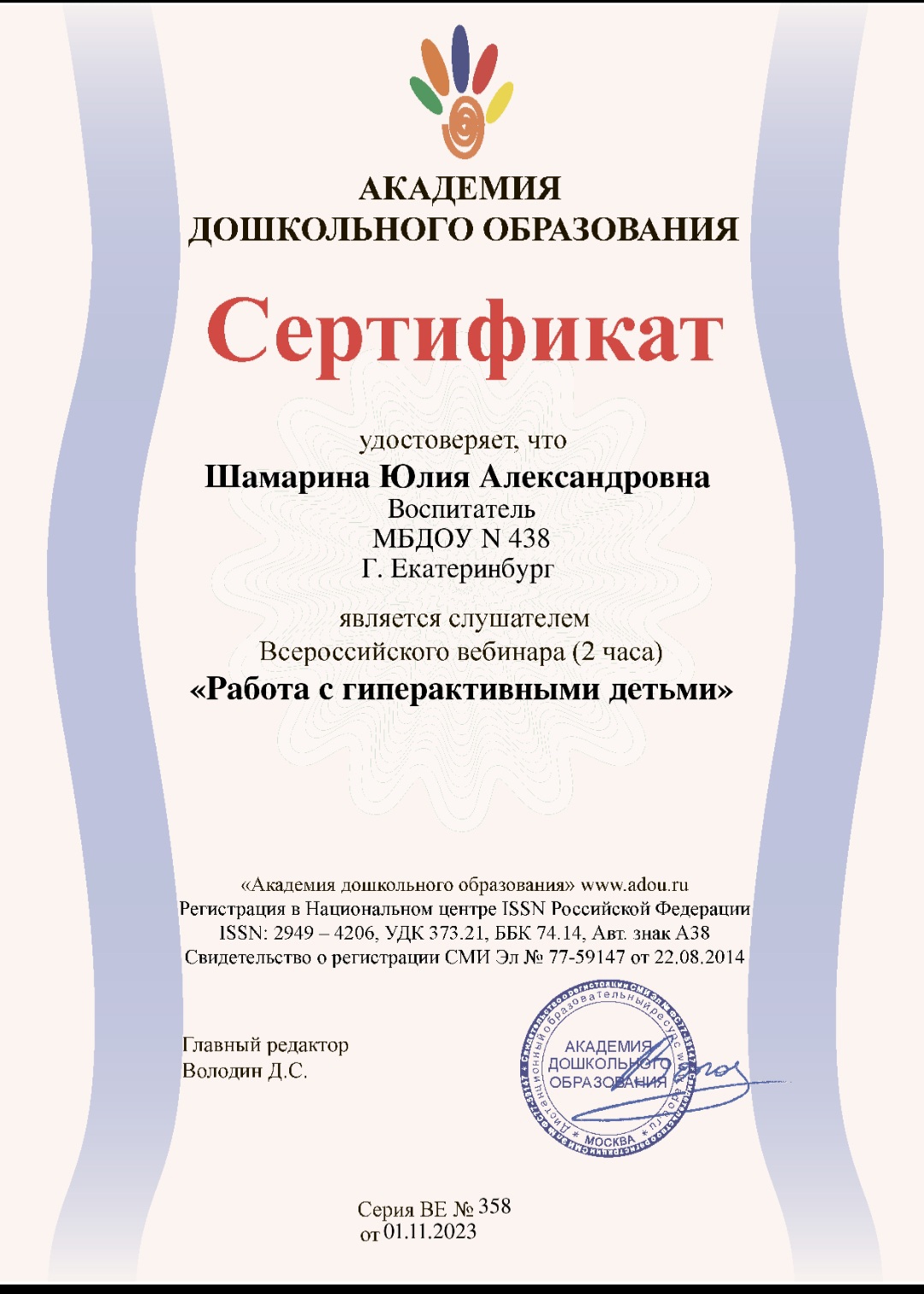 2. Всероссийский вебинар «Академия Дошкольного образования» тема: «Работа с гиперактивными детьми» (2 часа)