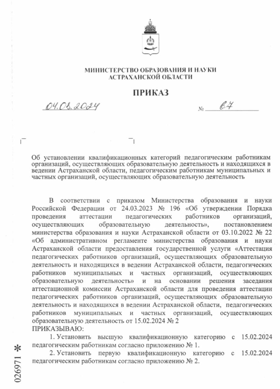 Приказ №67 от 4.03.2024 года.
