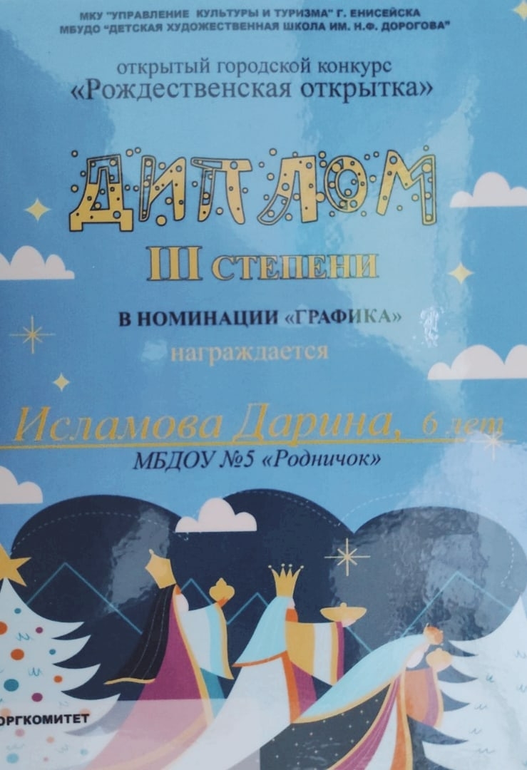 Диплом III воспитаннице подготовительной группы Рождественская открытка