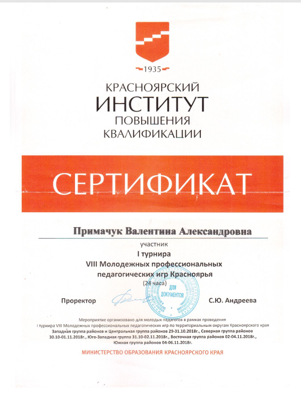 Сертификат участника VIII Молодежных профессиональных игр Красноярья