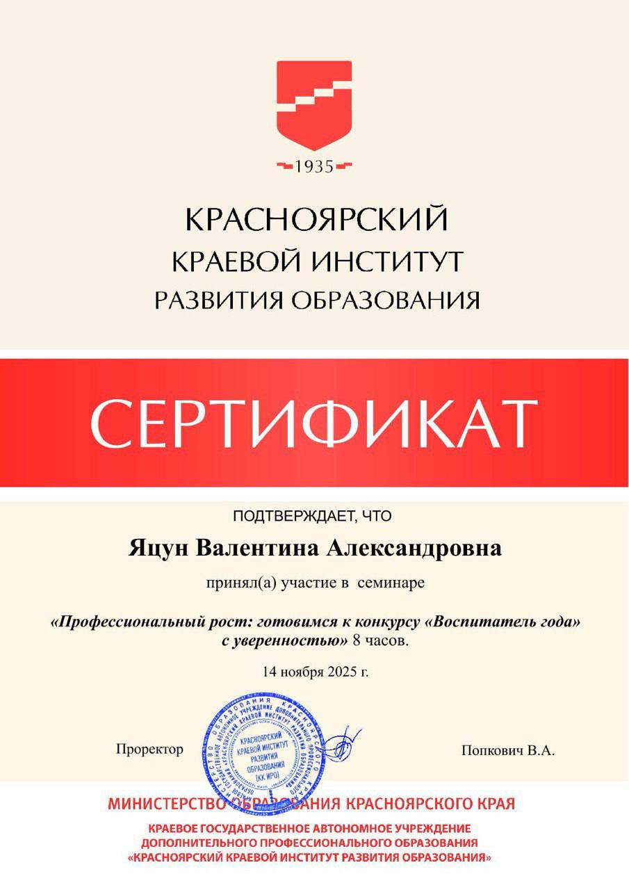 Сертификат участие в семинаре "Профессиональный рост готовимся к конкурсу "Воспитатель года" с уверенностью 2025 год